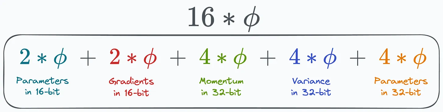 Let’s take Adam as a concrete example. Mixed precision training of a model with Φ parameters using Adam requires enough memory to hold an fp16 copy of the parameters and the gradients, with memory requirements of 2Φ and 2Φ bytes respectively. In addition, it needs to hold the optimizer states: an fp32 copy of the parameters, momentum and variance, with memory requirements of 4Φ, 4Φ, and 4Φ bytes, respectively.