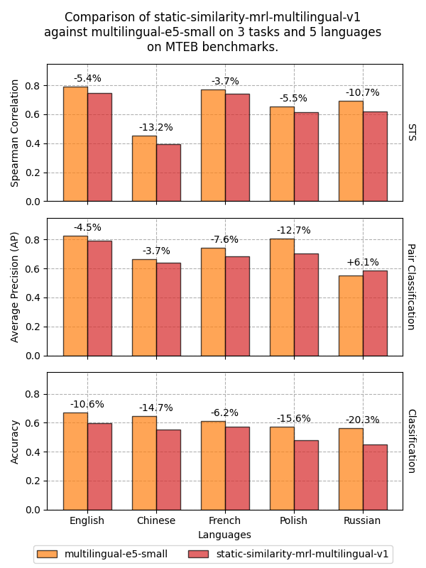 We apply this recipe to train two extremely efficient embedding models: sentence-transformers/static-retrieval-mrl-en-v1 for English Retrieval, and sentence-transformers/static-similarity-mrl-multilingual-v1 for Multilingual Similarity tasks. These models are 100x to 400x faster on CPU than common counterparts like all-mpnet-base-v2 and multilingual-e5-small, while reaching at least 85% of their performance on various benchmarks.