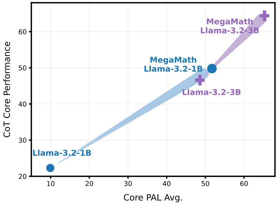 We also release two proof-of-concept models which is based on Llama-3.2-1B and LLama-3.2-3B. Training MegaMath on Llama-3.2-1B and LLama-3.2-3B brings about 15% ~ 20% performance boost on 10 downstream benchmarks, demonstrateing its high data quality.