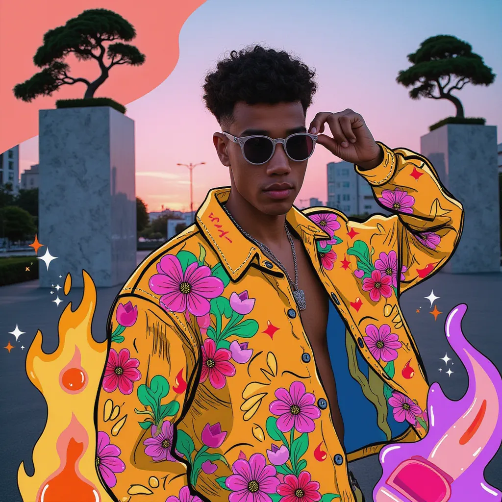 - In the style of TOK, a photo editorial avant-garde dramatic action pose of a person wearing 90s round wacky sunglasses pulling glasses down looking forward, in Tokyo with large marble structures and bonsai trees at sunset with a vibrant illustrated jacket surrounded by illustrations of flowers, smoke, flames, ice cream, sparkles, rock and roll
