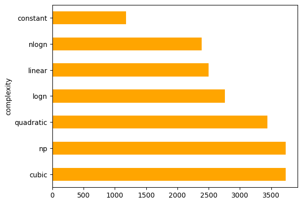 df.groupby('complexity')['src'].apply(lambda x: x.str.len().mean()).sort_values(ascending=False).plot.barh(color="orange")