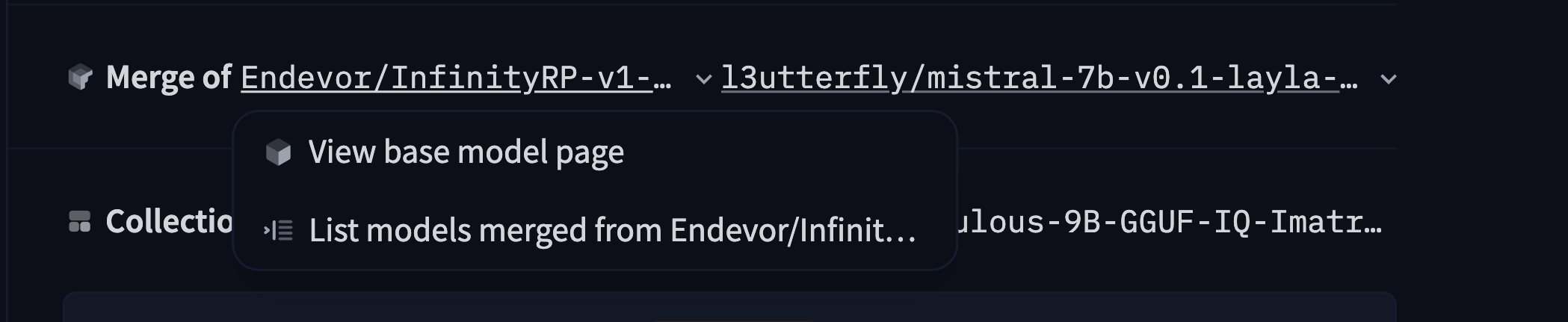 - l3utterfly/mistral-7b-v0.1-layla-v4The Hub will infer the type of relationship from the current model to the base model ("adapter", "merge", "quantized", "finetune") but you can also set it explicitly if needed: base_model_relation: quantized for instance.