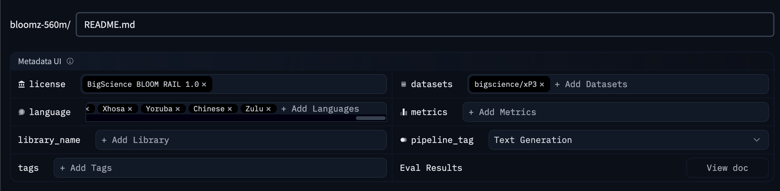 You can also directly edit the YAML section of the README.md file. If the model card doesn’t already have a YAML section, you can add one by adding three --- at the top of the file, then include all of the relevant metadata, and close the section with another group of --- like the example below: