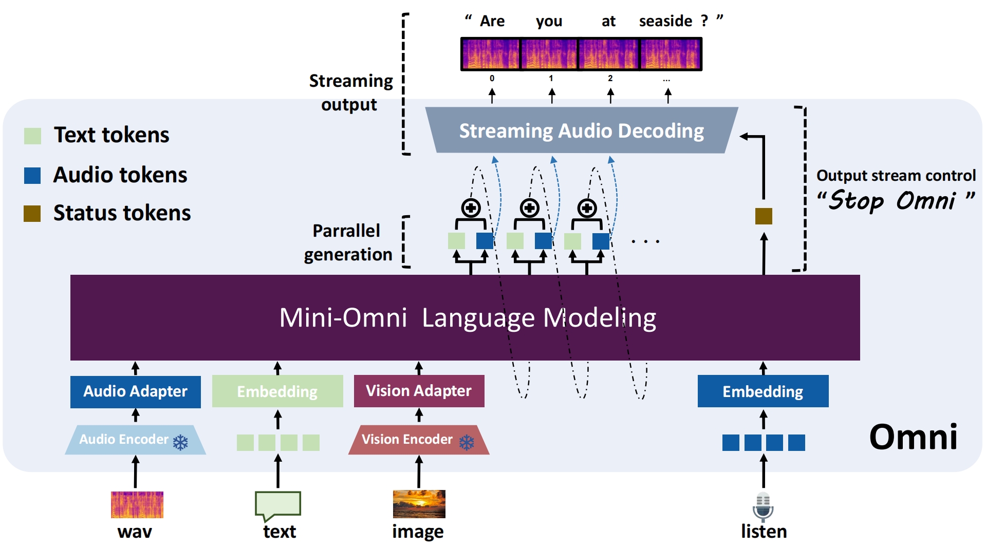 1. Multimodal Modeling: We use multiple sequences as the input and output of the model. In the input part, we will concatenate image, audio and text features to perform a series of comprehensive tasks, as shown in the following figures. In the output part, we use text-guided delayed parallel output to generate real-time speech responses.