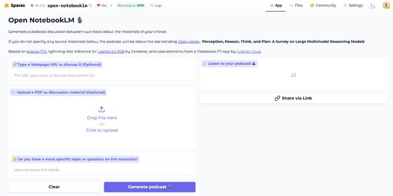 The app's workflow is simple. Given a source PDF or URL, it extracts the content from it, then tasks Meta's Llama 3.3-70B with writing the podcast script, with a good prompt crafted by @gabrielchua ("two hosts, with lively discussion, fun notes, insightful question etc.") Then it hands off the text-to-speech conversion to Kokoro-82M, and there you go, you have two hosts discussion any article.