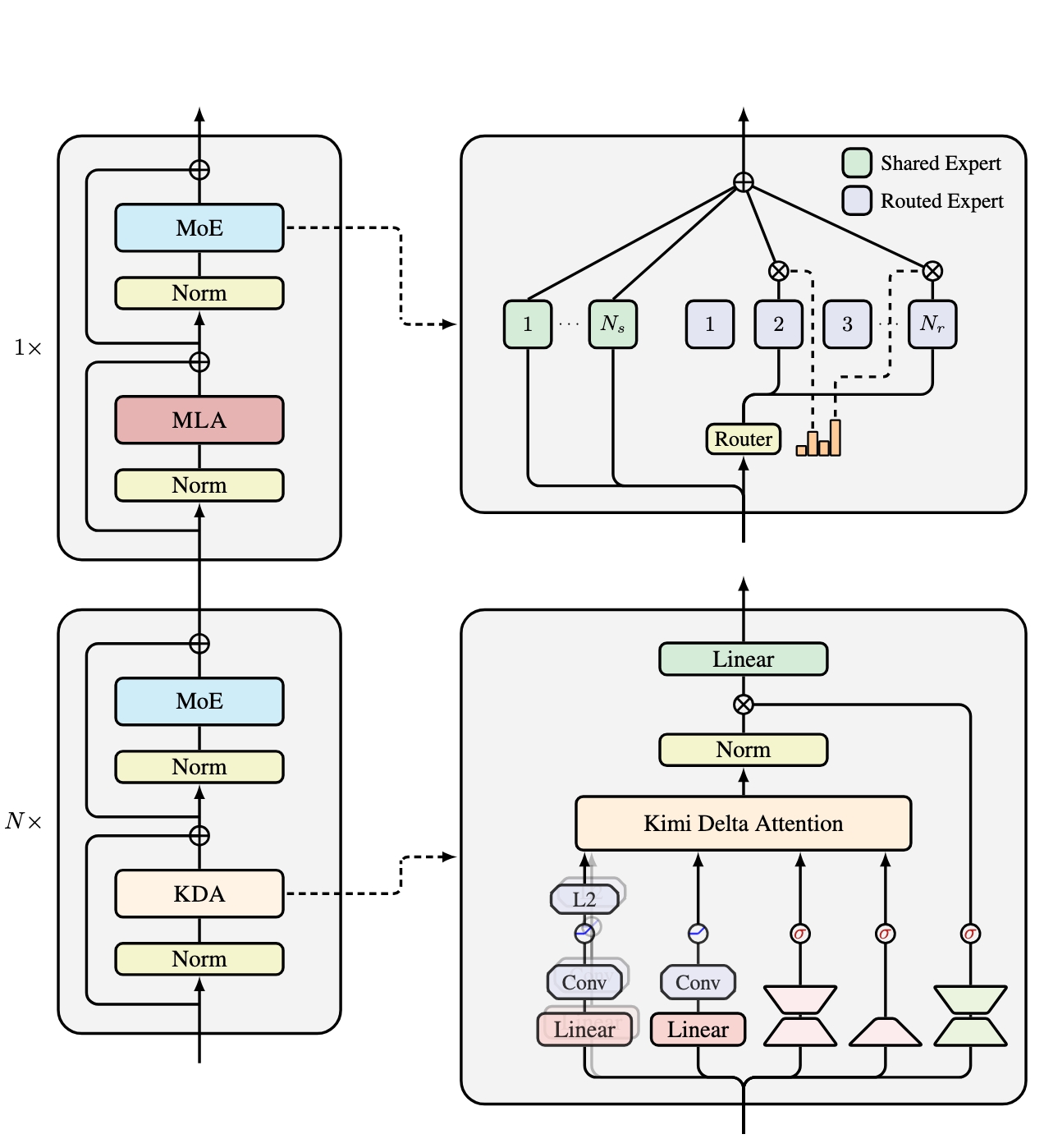 - Hybrid Architecture: A 3:1 KDA-to-global MLA ratio reduces memory usage while maintaining or surpassing the quality of full attention.