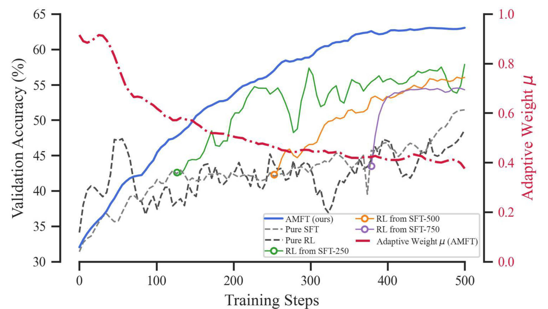 AMFT, a single-stage fine-tuning method that uses meta-gradients to dynamically balance supervised learning and reinforcement learning, improving reasoning performance and out-of-distribution generalization.