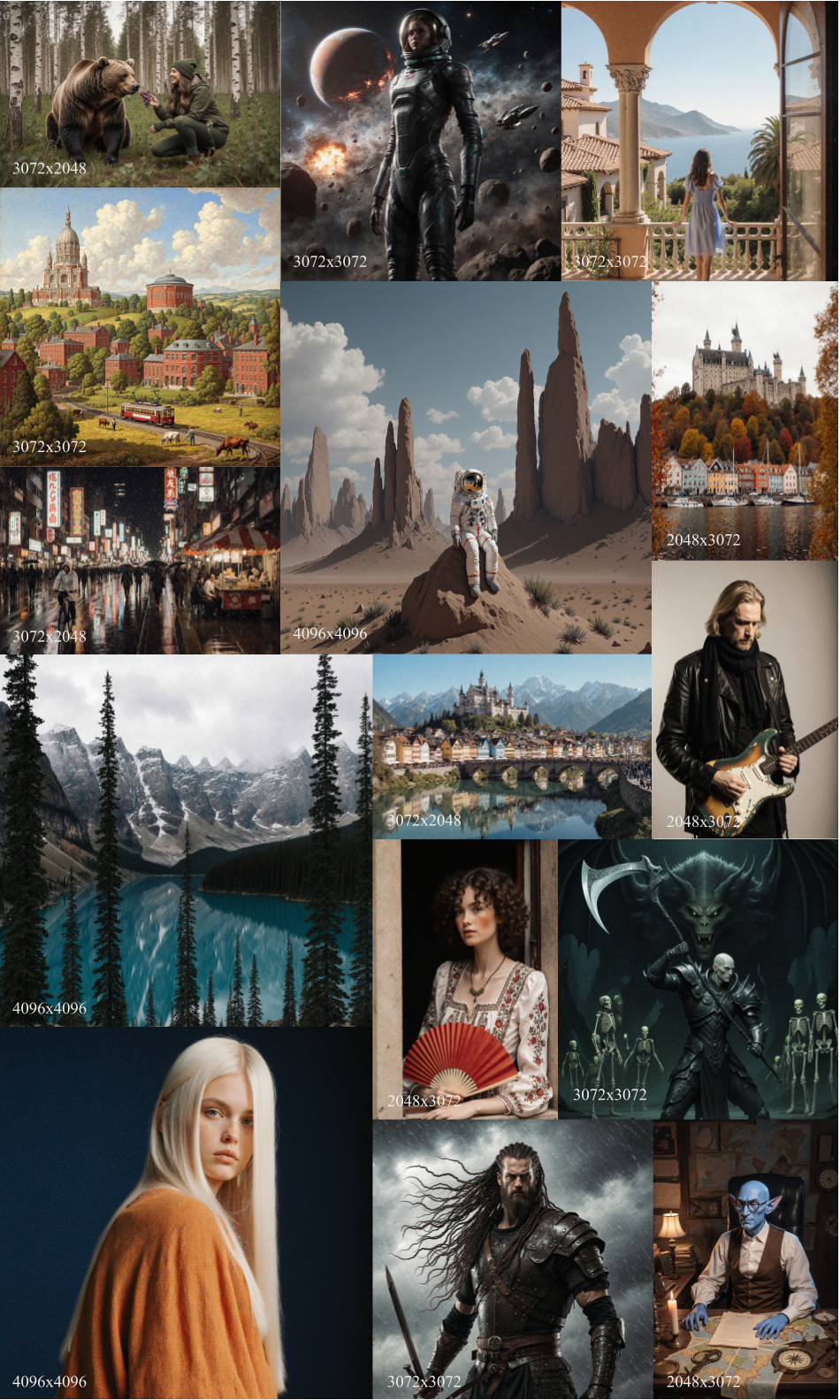 DyPE (Dynamic Position Extrapolation) enables pre-trained diffusion transformers to generate ultra-high-resolution images far beyond their training scale. It dynamically adjusts positional encodings during denoising to match evolving frequency content—achieving faithful 4K × 4K results without retraining or extra sampling cost.