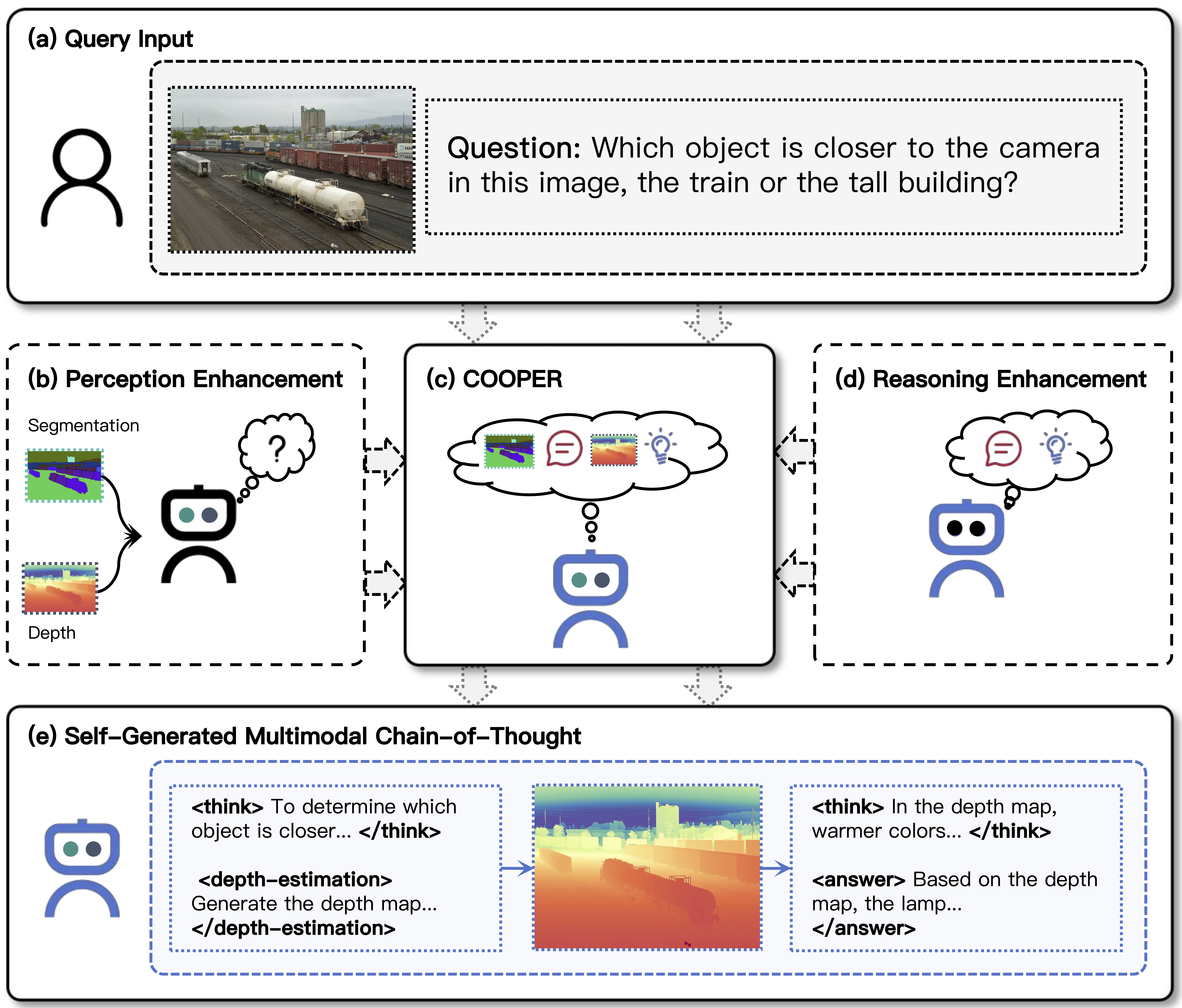 We propose \textbf{COOPER}, a unified MLLM that leverages depth and segmentation as auxiliary modalities and is trained in two stages to acquire auxiliary modality generation and adaptive, interleaved reasoning capabilities.