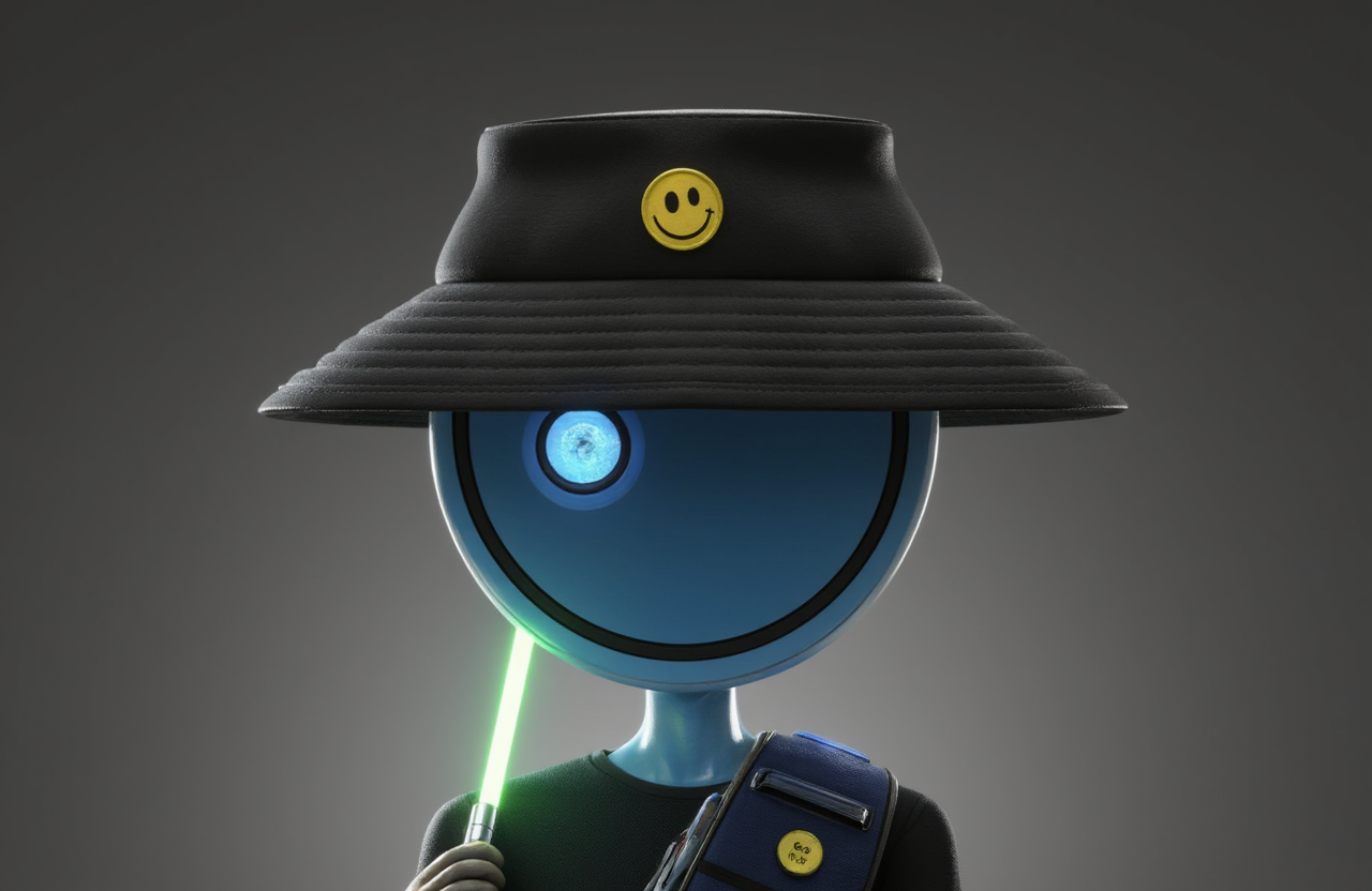 C33 Design, a close-up shot captures a vibrant blue smiley face, adorned with a black hat adorned with two yellow buttons. The hat is adorned with an eye-level yellow circle with a smiling face, adding a pop of color to the scene. The eyes are glowing blue, creating a striking contrast to the black hat. The helmet is adorned by a black strap, adding depth to the composition. The background is a muted gray, adding to the overall composition.