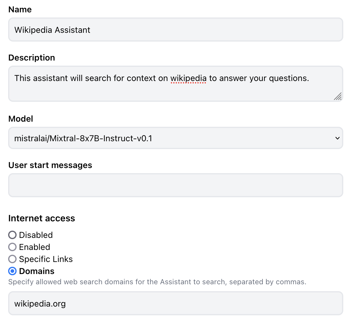 In this mode you can restrict the domains used in the web search. This is equivalent to appending site:example.com to the web query. For example if you want to make an assistant that only uses wikipedia as a source: