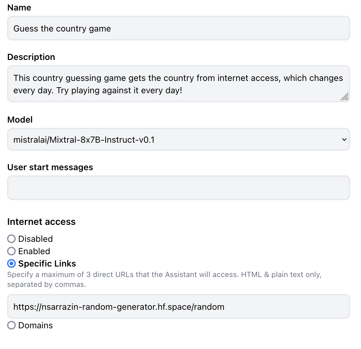Hey! We have just released an update to HuggingChat Assistants that allows you to connect them to the Internet to get more relevant and interactive answers. When you create or edit an Assistant, you will now see an option for Internet access. It can have four settings: enabled, domain search, specific links, and disabled.